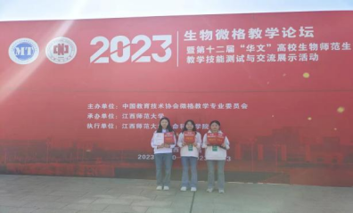 10月20日-10月23日,由中国教育技术协会微格教学专业委员会主办、江西师范大学承办的2023生物微格教学论坛暨第十二届“华文”高校生物师范生教学技能测试与交流展示活动在江西师范大学瑶湖校区举行。经过业内专家评审与现场教学技能展示,公司2021级生物科学专业刘素素、刘琪、罗浩兰分获教学设计二等奖、三等奖,且在教学技能测试中均获三等奖。据悉,此次活动共收到参赛作品450余件,450选手名参赛,竞争十分激烈。