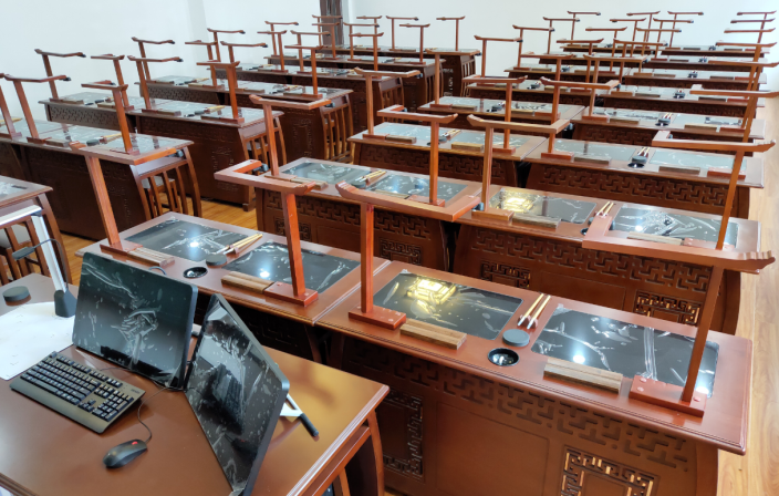 智能化书写技能实训室是一个集书法教学数字化、标准化、流程化、高效化的实训室,它提供书法文化、教学视频、大量碑帖练习和作品上传等模块,可教授毛笔书法、兼顾硬笔书法,将传统书法教学效率提升数倍,从根本上解决书法“临”和“摹”相结合的解决方案,实现“摹、摹、临、摹、临”五步学习法,直观、快速、高效,是师范生快速提升书写技能的重要平台。